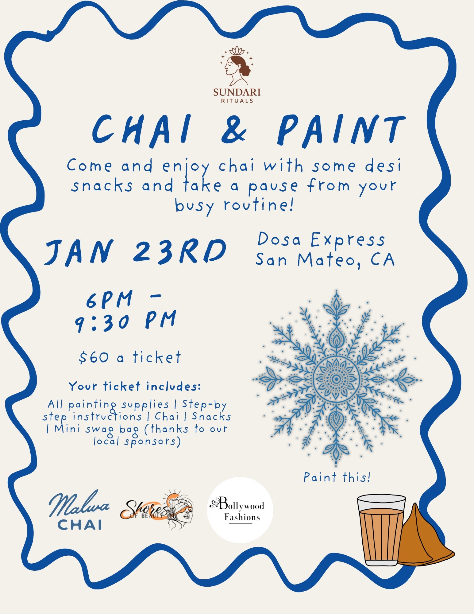 Take a gentle pause from your busy routine and join us for an evening filled with creativity, chai, and community. Our Chai & Paint Night is designed to help you unwind, connect with others, and have fun creating something beautiful; all while enjoying comforting desi snacks.